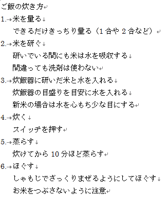 - 「箇条書き(リスト)」内で、項目を変えずに改行しないとき、「表」内で、隙間を開けずに開業させたいときなどにも使用します。