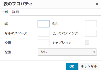 - 表のプロパティを設定 ― 表の内部にカーソルを入れた状態で、「テーブル」ボタン >「表のプロパティ」をクリックすると「表のプロパティ」ウィンドウが表示します。表のプロパティで主に使用するのは、主に「幅」と「キャプション」です。