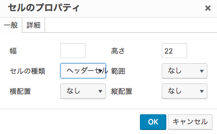 - その他のセルのプロパティ ― その他のセルのプロパティには、テーブルと同じく「幅」、セル内コンテンツの横方向・縦方向の揃え位置を指定する「横配置」「縦配置」があります。「幅」は単位無しでの入力でpx単位となります。空欄の状態では、ブラウザにより自動で「幅」が規定されます。