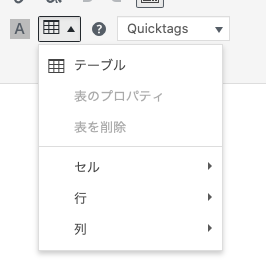 テーブル(表)を挿⼊・設定するには、「テーブル」ボタンを使用します。「テーブル」ボタンをクリックするとテーブル関連の項⽬がドロップダウンで表示されます。
