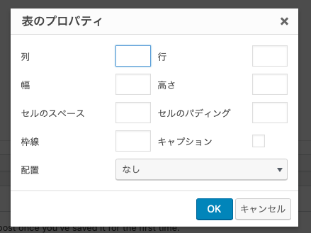 - テーブルを挿入 ―ドロップダウンメニュー「テーブル」をクリックします。テーブル挿入のダイアログウィンドウが表示されるので、任意の「列」および「行」数を指定して「OK」ボタンでテーブルを挿入します。表キャプションが必要な場合には、「キャプション」にチェックを入れます。